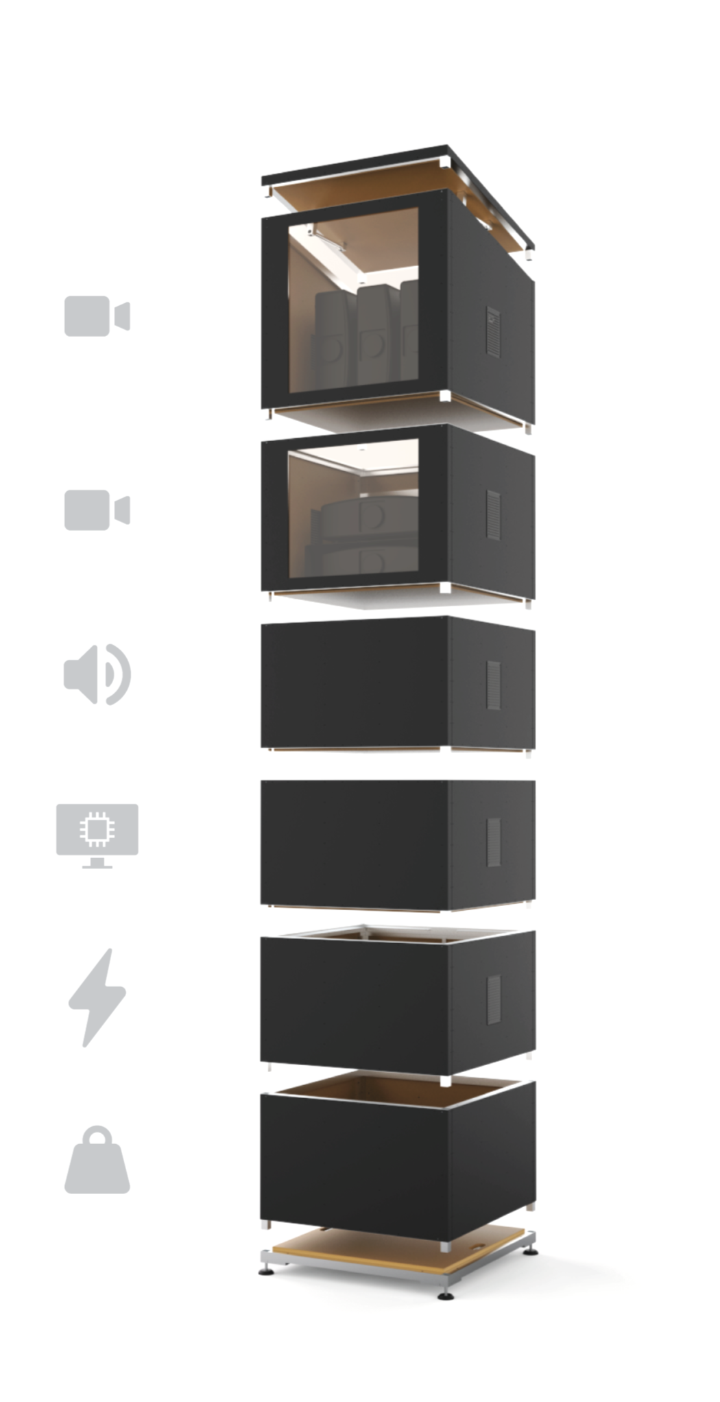 Pensée comme un jeu de construction, la tour se compose de modules empilables qui s’assemblent par panneaux. Chaque élément s’emboîte et se verrouille de l’intérieur pour garantir sécurité et rigidité une fois montée.